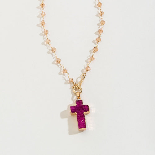 Necklace - Druzy cross pendant bead 20" necklace: pink